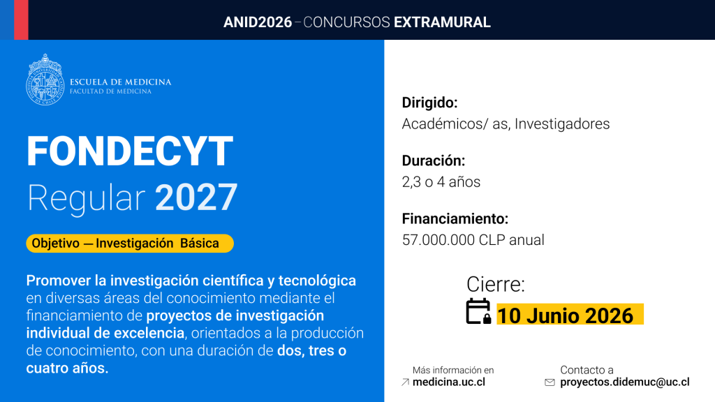 | Miércoles 27 de Mayo de 2026 | DIEMUC: El Investigador Responsable (IR) o el Co-Investigador (COI) de la Escuela de Medicina debe enviar la siguiente documentación a la DIEMUC al correo proyectos.didemuc@uc.cl: